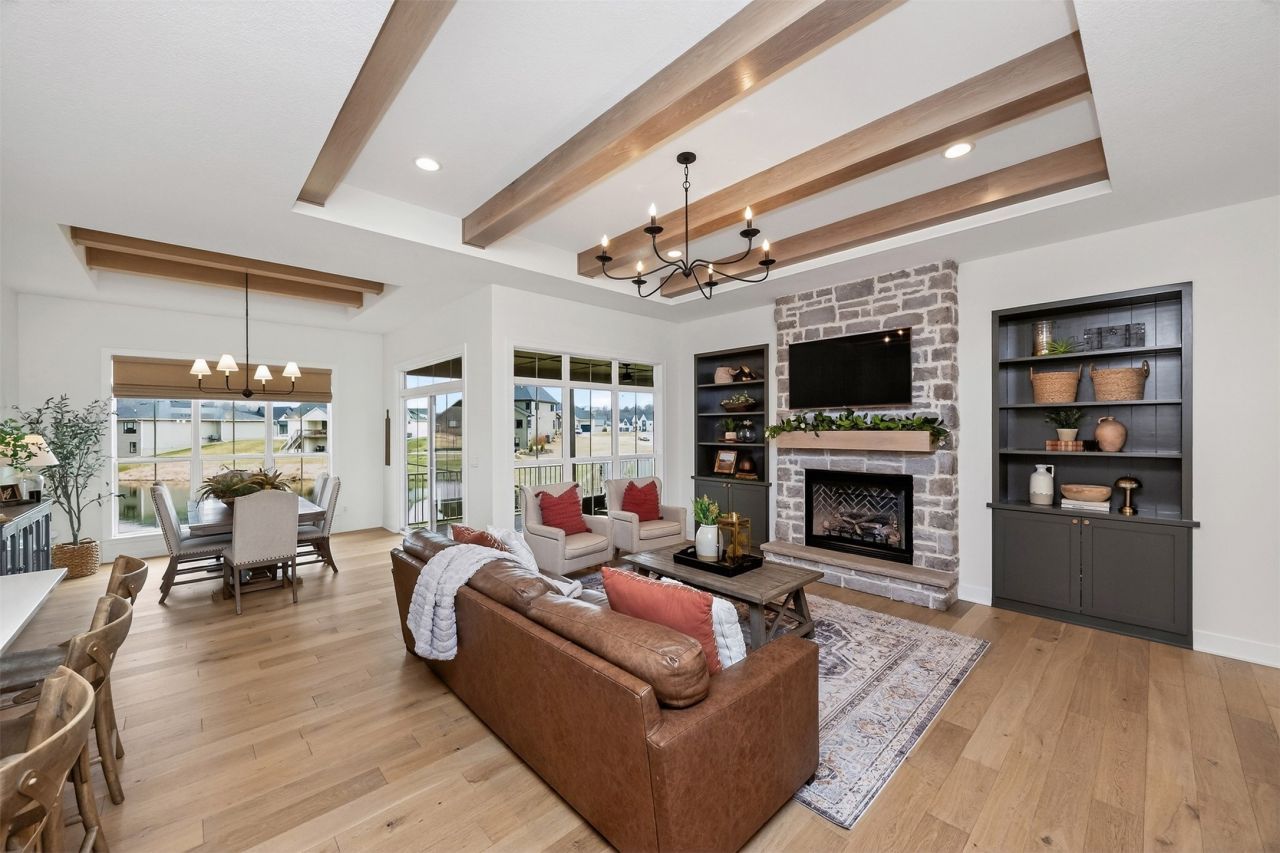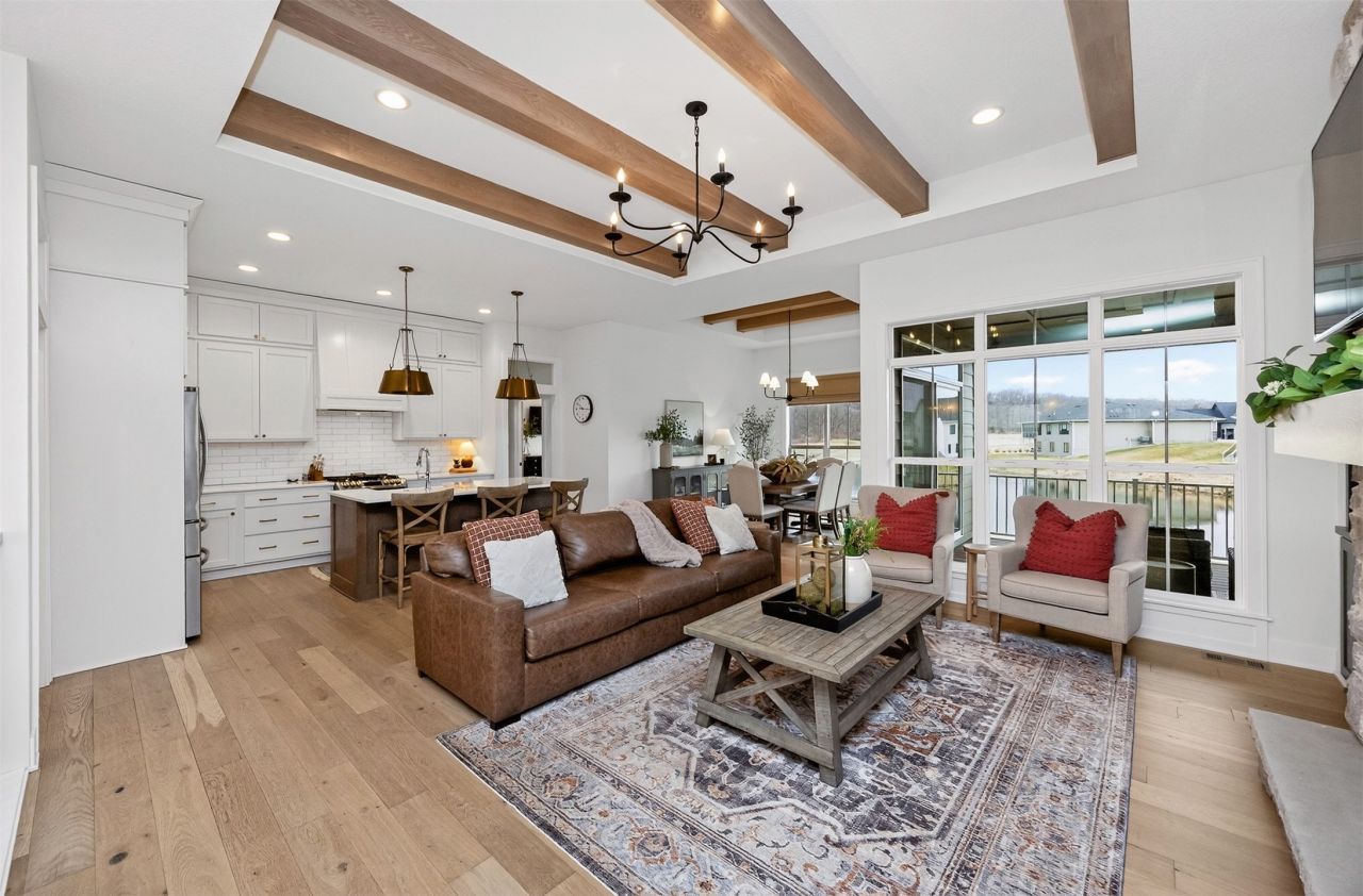 Backed by peaceful pond views and designed with intention at every turn, this move-in ready custom ranch in Timber Valley delivers the kind of everyday luxury buyers are waiting for. From the moment you arrive, the double-door entry sets the tone - welcoming, elevated, and thoughtfully curated. Inside, the main level blends warmth and sophistication with engineered hardwood floors, wood beam accents, and a striking stone fireplace flanked by custom built-ins. The kitchen is both beautiful and functional, featuring quartz countertops, a custom wood hood, gas range, white cabinetry with gold hardware, and a pantry that makes a statement with its brick flooring. Large windows allow for abundant natural light, motorized blinds add convenience and a polished finish throughout the space. The primary suite offers a true retreat with a full tile shower and a spacious walk-in closet, while two additional bedrooms provide flexibility for guests or daily living. The oversized, extra-deep 3-car garage - complete with 8' insulated doors - easily accommodates hobbies, storage, or even a home gym. The professionally finished lower level expands your lifestyle with a custom bar, hidden liquor cabinet, office with built-in cubby, two additional bedrooms, and a creative play space tucked under the stairs. Out back, the covered composite 12 x 23 deck invites you to unwind and take in tranquil water views - your own private escape, right at home.
