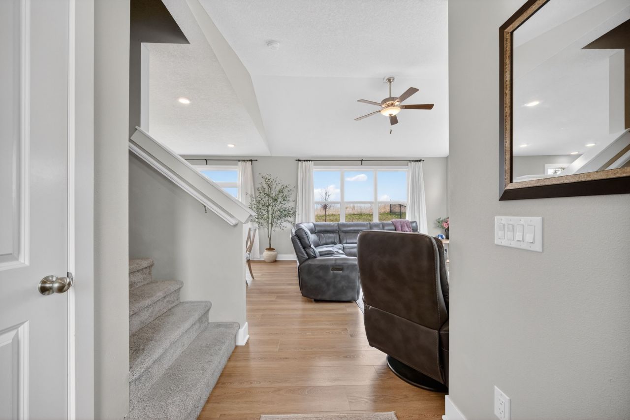 Welcome home to this bright and inviting two-story in Indianola, offering a functional layout designed for everyday living and easy entertaining. The vaulted living room is filled with natural light and flows seamlessly into the dining area and kitchen, creating an open, connected space. The kitchen features white cabinetry, stainless steel appliances, and quartz countertops, with direct access to the deck, perfect for outdoor dining and enjoying the spacious backyard with no rear neighbors. Upstairs, you'll find all three bedrooms, including a generous primary suite, along with the convenience of second-floor laundry. The unfinished basement is already stubbed for a future bath and provides excellent potential to expand and customize to fit your needs. Located in the Ashton Park development on the east side of town, this home is close to schools and local amenities, with the added bonus of remaining tax abatement for extra savings. All information obtained from seller and public records.