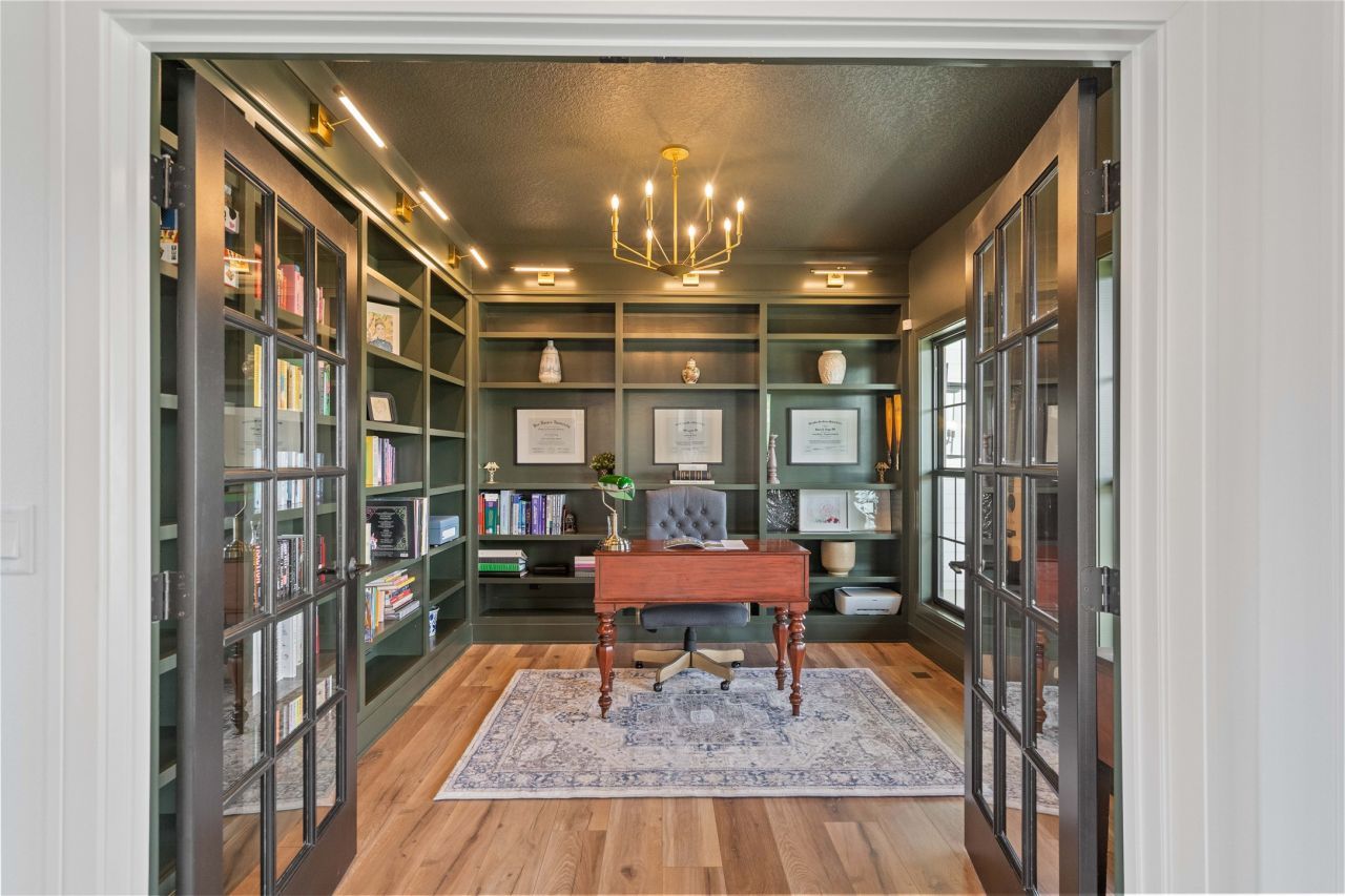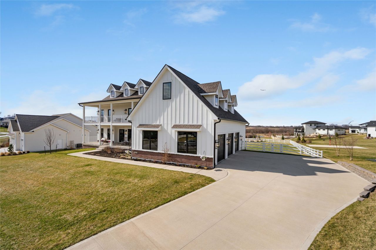 This home was featured in Trend Report as representative of Des Moines luxury living. Sitting on just under an acre, experience elevated living in this stunning luxury home, where thoughtful design meets high end finishes. A dramatic two story great room anchors the main level, complemented by a custom floor-to-ceiling library with a brass chandelier and formal dining room with black French doors. The kitchen is designed for both everyday living and entertaining, featuring a walk through prep pantry. The primary suite offers a spa-like retreat with dual walk-in closets, a freestanding soaking tub beneath a chandelier, and a custom tile shower. Enjoy a dedicated home theater with in-ceiling surround sound, a wet bar in the walkout lower level, a herringbone tile mudroom with built-ins, and main floor laundry with custom cabinetry. Take in beautiful sunset views over the pond from the primary suite and living room. Outdoor living spans three levels with a covered front porch, main deck, and lower patio, all with direct access. The fully fenced yard features a white vinyl split rail fence, a garden with programmable drip irrigation, and professionally landscaped grounds. Additional highlights include three car garage, dual EV chargers and dual-zone HVAC for comfort and efficiency. Don't miss your chance to see this exceptional home in person.