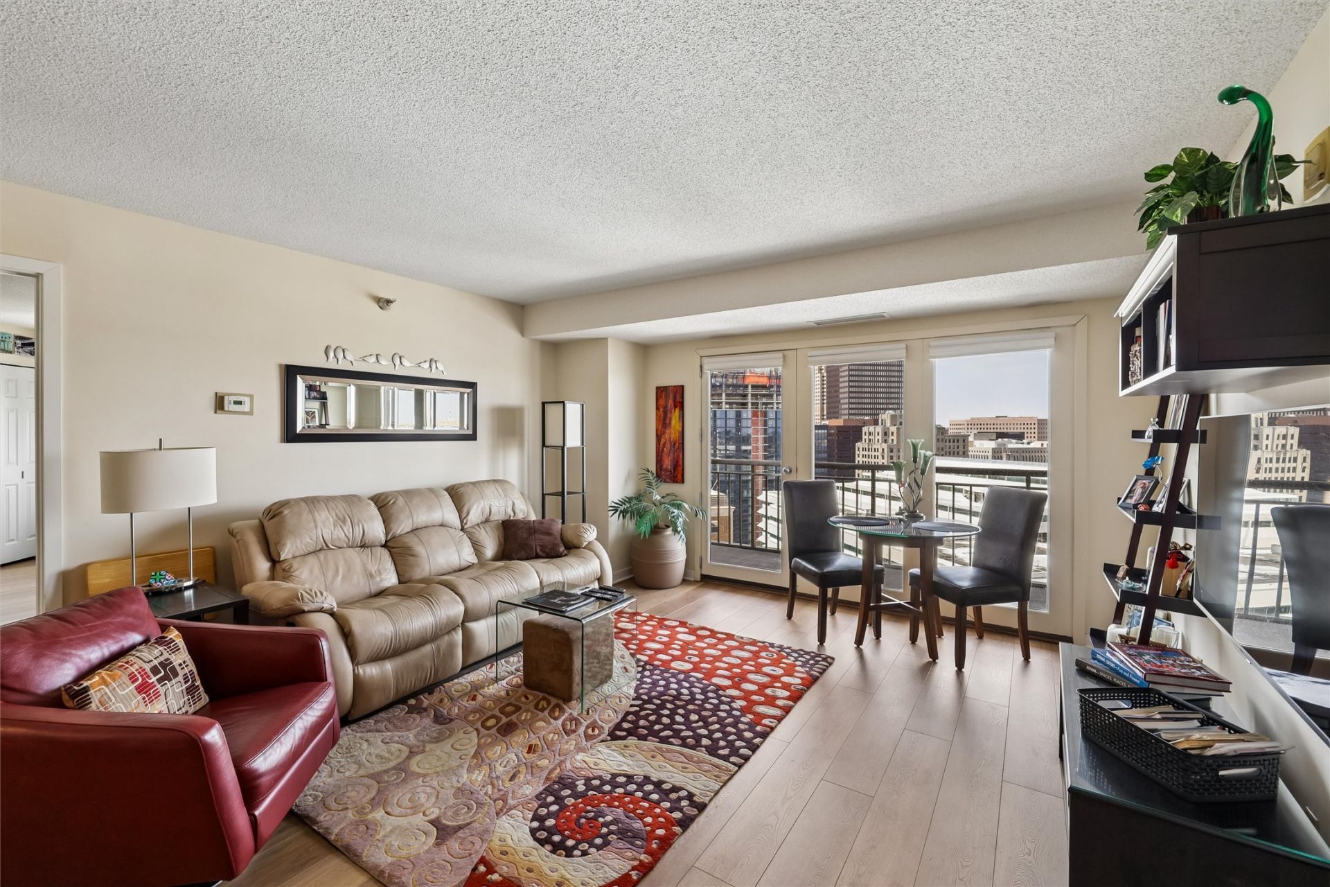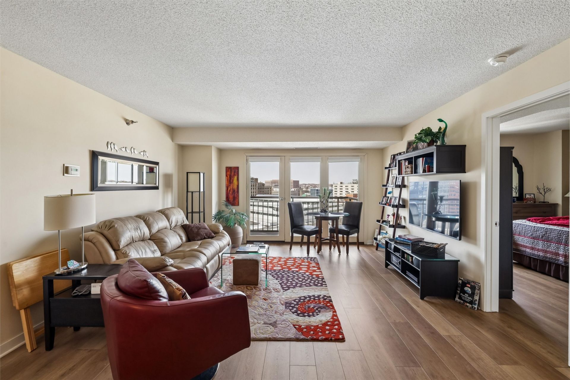 Rare find in the iconic Plaza building with this two bedroom two bath unit located on the 18th floor. Open concept. Kitchen features stainless appliances and granite counters with bar seating. Dining area with built-in wine/coffee bar. Spacious primary bedroom with large closet and full bath. Second ensuite bedroom is great for guests, or for use as office/den. Balcony off the living room offers sweeping views of the city and river. On-site management and maintenance, recreational facilities including outdoor pool, exercise room, sauna, tennis/pickleball and community room. Two large patio areas with outdoor gardening, barbeque, gazebo and basketball court. Great location for all that is happening in the Downtown neighborhood. The Farmer's Market is right out your door, steps away from the Civic Center and Cowles Commons, catch a game, experience all of the dining options downtown has to offer or check out the recreational trails. Underground parking and skywalk access are ideal, especially in the winter months. Enjoy the sweeping views of the city from your private balcony.