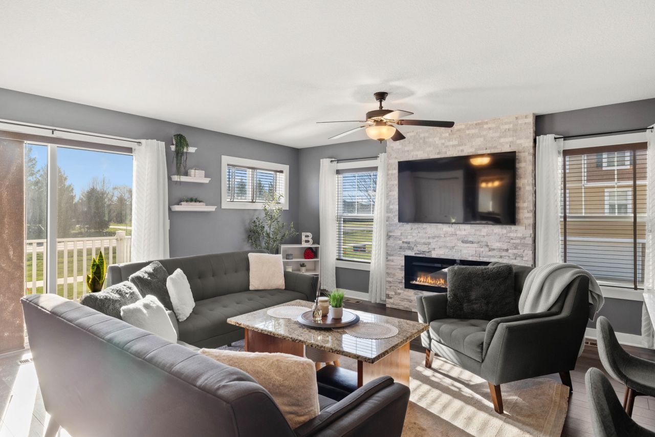 Bright, open, and move-in ready - this end-unit townhome in NE Ankeny offers 2 bedrooms, 3 bathrooms, and nearly 1,300 total SF filled with natural light. The main level features an inviting open-concept layout with large windows, new hard-surface flooring in the living room, and a stunning floor-to-ceiling stone fireplace. The kitchen is complete with granite countertops, large center island, tile backsplash, pantry, and a convenient half bath - ideal for both everyday living and entertaining. Step right out from the living room onto the deck and enjoy your outdoor space (with great views)! Upstairs you'll find two spacious bedrooms, including a primary suite with its own ensuite bath and walk-in closet, along with the convenience of second-floor laundry. New carpet installed in 2025 adds a fresh, updated feel. All appliances stay, including a new dishwasher and a new washer & dryer. Additional highlights include custom blinds and a 2-car attached garage. Enjoy low-maintenance living with HOA services covering lawn care and snow removal. Ideally located near parks, schools, golf courses, everyday amenities, and quick access to I-35. All information obtained from seller and public records.
